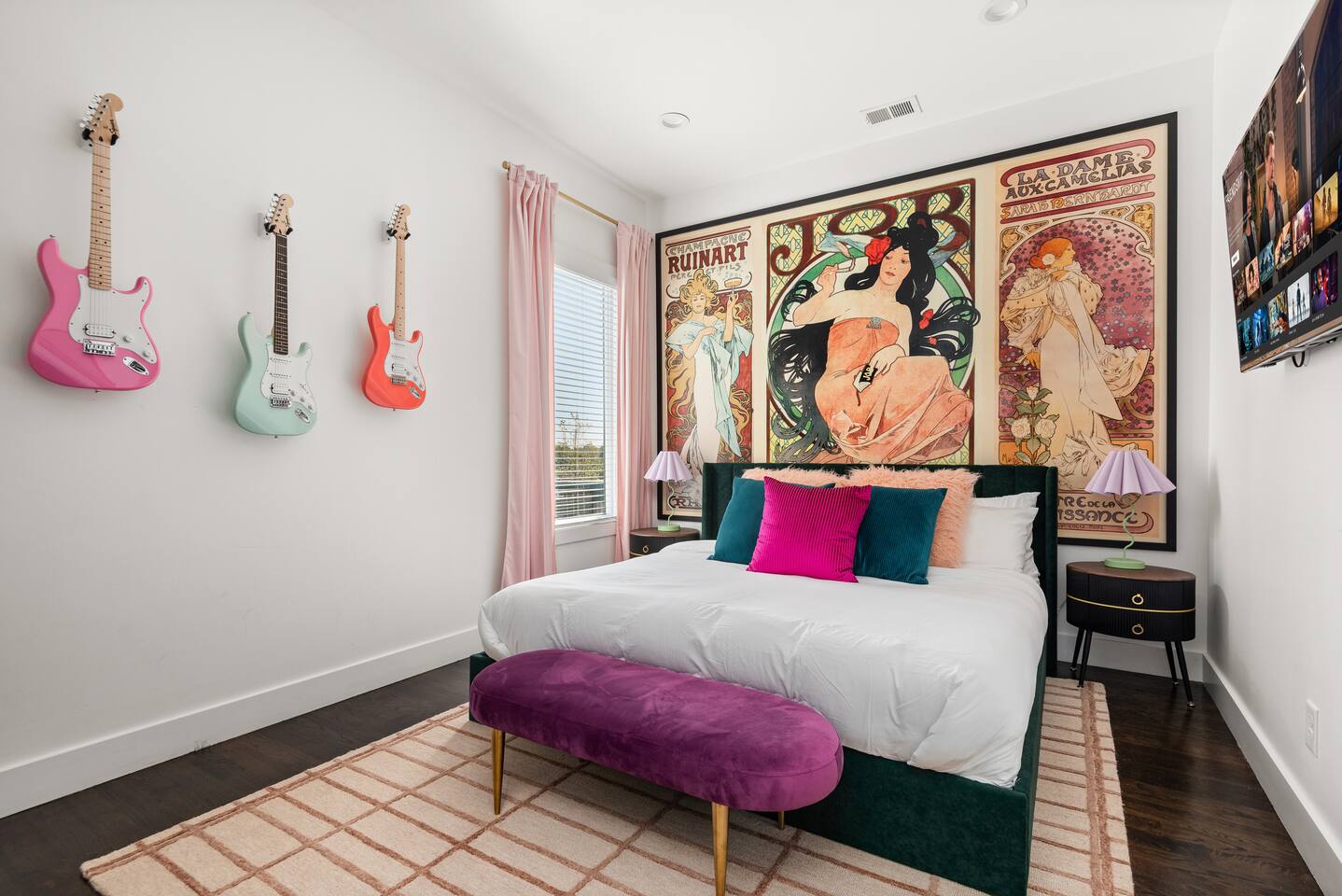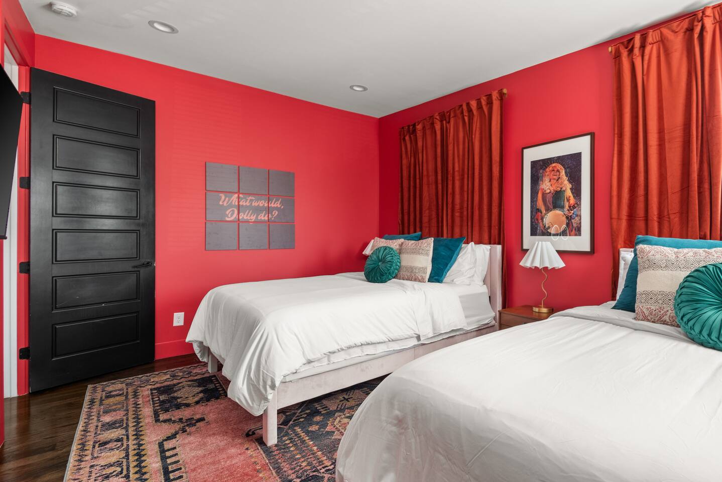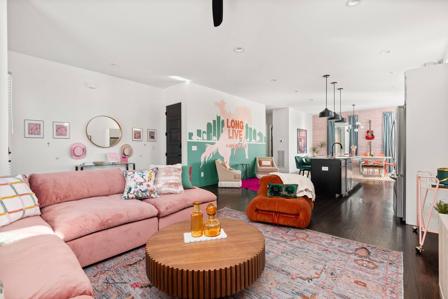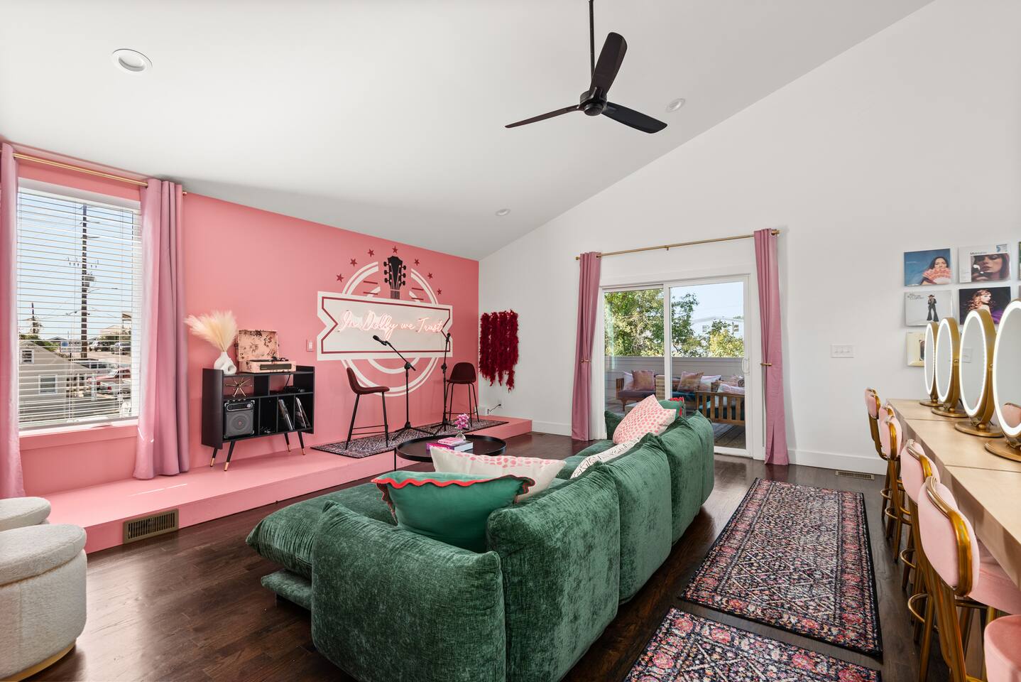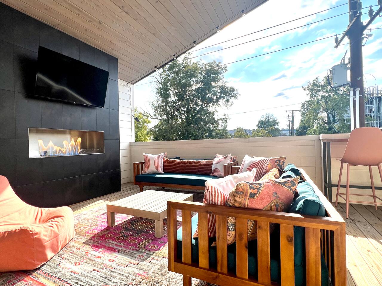 Perfect for: Girl's weekends, family reunions and groups seeking a fun and stylish experience. ⭐️⭐️ Key Features ⭐️⭐️ ★ Custom Murals and Karaoke Stage ★ Glam Station: Equipped with 6 large LED mirrors ★ Stylish Decor: Neon signs, photo-worthy spots and modern amenities ★ Detached Home: No shared walls ★ Outdoor Oasis: Covered deck with fireplace, TV, custom lighting and plenty of seating ★ Spacious Living: 3 floors of living space, including 2 large living areas ★ Parking: 3 cars total; 2 in garage and 1 behind the house ★ Convenient Location: Broadway (10min), 12 South (4 min), The Gulch (8 min), and the airport (10min). ★ Located on a quiet dead end street. ★ Professionally Redesigned in 2025 What our Guests are saying: “If you're thinking about it - DO IT! We have been visiting Nashville regularly for almost a decade and this was our absolute favorite stay” – Emma “The glam stations were what sold me on booking this place. It was so fun to have an area where all the girls can get ready at the same time." – Nicole “This house was absolutely beautiful. I mean it was phenomenal. We walked in and were so amazed. Also it smelled really good all through the house” – Tammy “This place was beyond our expectations!! All the amenities were there! So well stocked and LINENS AND BEDS ARE ABSOLUTELY the best we've been to!” – Joni ⭐️⭐️ Floor Plan ⭐️⭐️ Floor 1: (Dine and Hang) Open floor plan includes living room, fully stocked kitchen with complimentary coffee, tea and cookware. Large dining table (fits 10) with extra seating around the island or in front of the 14' custom Cowgirl mural. Convenient half bath rounds out the space. Floor 2: (Get your Sleep) Bedroom 1 (TSwift Room) King bed with en suite bathroom and large walk in closet. Bedroom 2 (Mural Room) King bed with closet. Bedroom 3 (Bunk Room) 2 Queen beds with closet. Full bathroom and W/D located on this floor. Floor 3: (Sing and Have Fun) Bedroom 4 (Dolly Room) 2 Queen beds with closet Loft with vaulted ceilings, TV, karaoke stage and getting ready stations while you take turns on the mic! Full bathroom also located on this floor. This space opens up to the covered deck with a fireplace, TV and 2 couches (seating for 10). Custom neon sign and bistro lights turn on once the sun goes down. ⭐️⭐️ Amenities ⭐️⭐️ ★ Comfort and Convenience: Keyless entry, fast WiFi, and smart TVs in all bedrooms and common areas. ★ Entertainment: YouTubeTV included for your viewing pleasure. ★ Work Space: Plenty of places to work in the house for those that need to mix work with pleasure. ★ Support: Enjoy exceptional service from a local super host. ★ Privacy: All bedrooms have black out curtains and room darkening shades. We’ve partnered with Bach Babes for ultimate concierge services! Inquire for more details. You’ll have access to: ★ Pre Arrival Decorating ★ Fridge Stocking ★ Mimosa Bars ★ Goodie Bags ★ Itinerary Planning ★ Exclusive discounts around town Dates Booked? Check out our other listing The Vinyl Suite for availability! Permit#2025-01-05-620