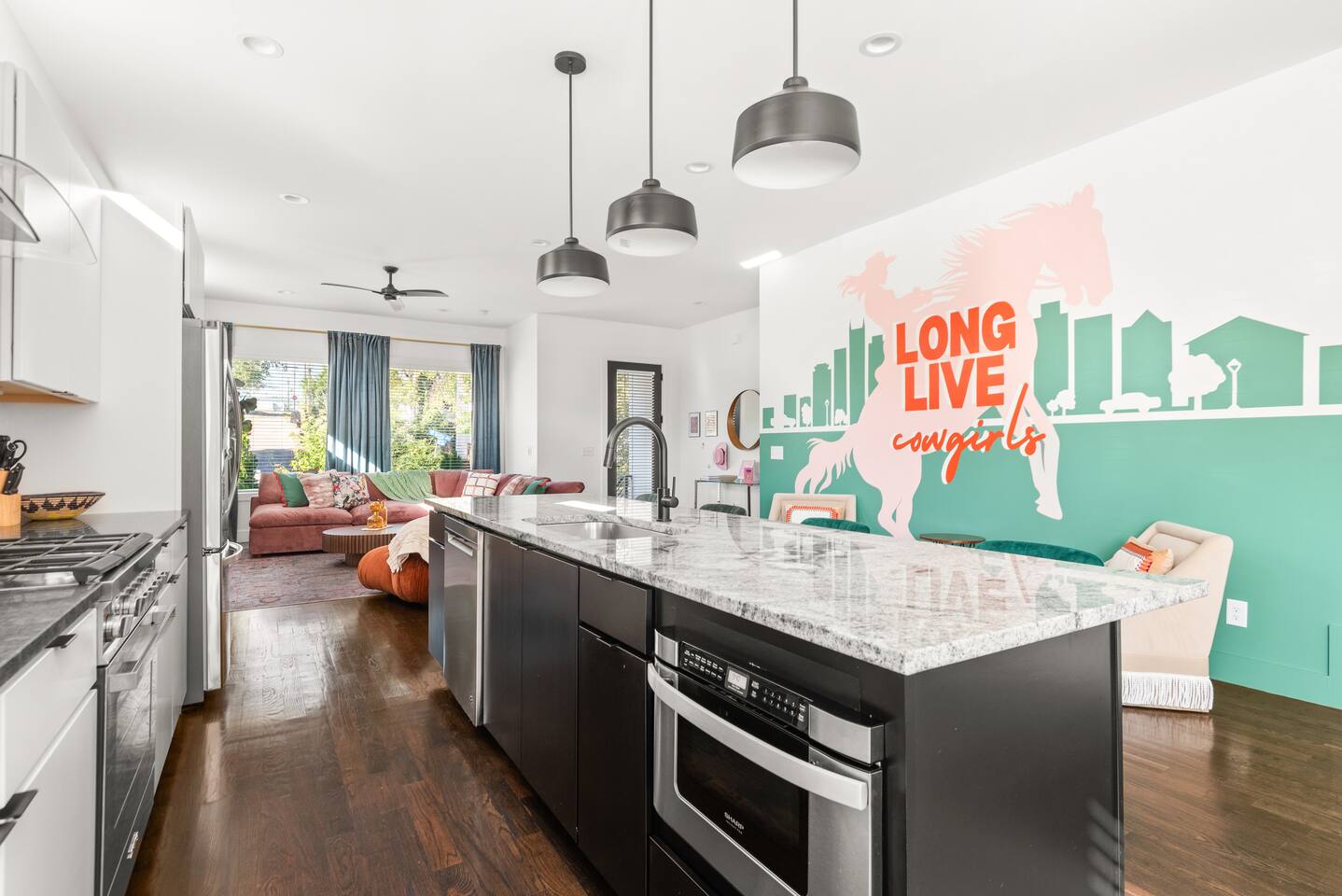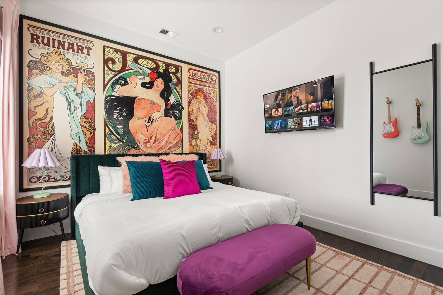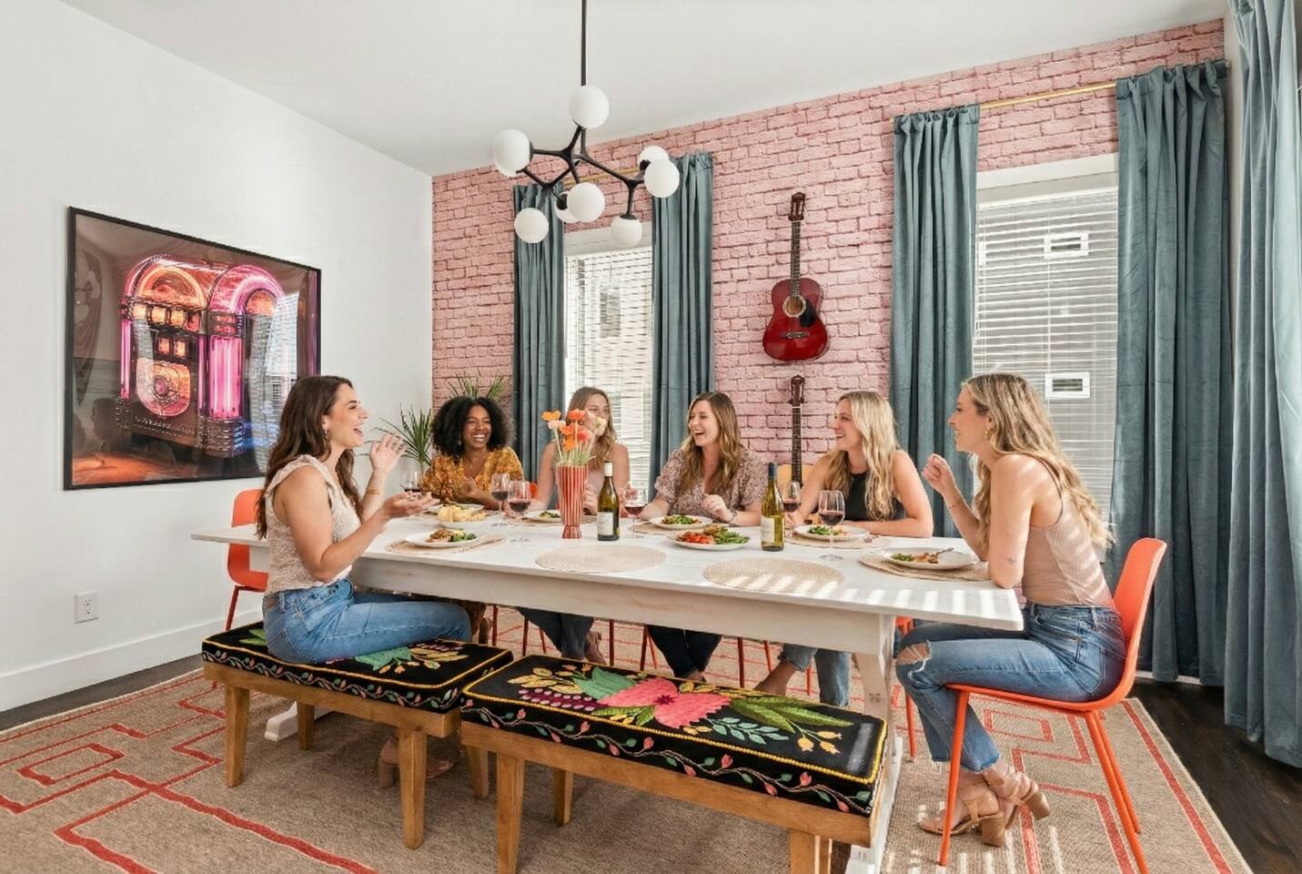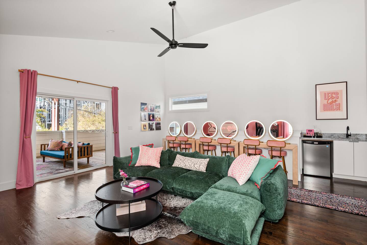 Perfect for: Girl's weekends, family reunions and groups seeking a fun and stylish experience. ⭐️⭐️ Key Features ⭐️⭐️ ★ Custom Murals and Karaoke Stage ★ Glam Station: Equipped with 6 large LED mirrors ★ Stylish Decor: Neon signs, photo-worthy spots and modern amenities ★ Detached Home: No shared walls ★ Outdoor Oasis: Covered deck with fireplace, TV, custom lighting and plenty of seating ★ Spacious Living: 3 floors of living space, including 2 large living areas ★ Parking: 3 cars total; 2 in garage and 1 behind the house ★ Convenient Location: Broadway (10min), 12 South (4 min), The Gulch (8 min), and the airport (10min). ★ Located on a quiet dead end street. ★ Professionally Redesigned in 2025 What our Guests are saying: “If you're thinking about it - DO IT! We have been visiting Nashville regularly for almost a decade and this was our absolute favorite stay” – Emma “The glam stations were what sold me on booking this place. It was so fun to have an area where all the girls can get ready at the same time." – Nicole “This house was absolutely beautiful. I mean it was phenomenal. We walked in and were so amazed. Also it smelled really good all through the house” – Tammy “This place was beyond our expectations!! All the amenities were there! So well stocked and LINENS AND BEDS ARE ABSOLUTELY the best we've been to!” – Joni ⭐️⭐️ Floor Plan ⭐️⭐️ Floor 1: (Dine and Hang) Open floor plan includes living room, fully stocked kitchen with complimentary coffee, tea and cookware. Large dining table (fits 10) with extra seating around the island or in front of the 14' custom Cowgirl mural. Convenient half bath rounds out the space. Floor 2: (Get your Sleep) Bedroom 1 (TSwift Room) King bed with en suite bathroom and large walk in closet. Bedroom 2 (Mural Room) King bed with closet. Bedroom 3 (Bunk Room) 2 Queen beds with closet. Full bathroom and W/D located on this floor. Floor 3: (Sing and Have Fun) Bedroom 4 (Dolly Room) 2 Queen beds with closet Loft with vaulted ceilings, TV, karaoke stage and getting ready stations while you take turns on the mic! Full bathroom also located on this floor. This space opens up to the covered deck with a fireplace, TV and 2 couches (seating for 10). Custom neon sign and bistro lights turn on once the sun goes down. ⭐️⭐️ Amenities ⭐️⭐️ ★ Comfort and Convenience: Keyless entry, fast WiFi, and smart TVs in all bedrooms and common areas. ★ Entertainment: YouTubeTV included for your viewing pleasure. ★ Work Space: Plenty of places to work in the house for those that need to mix work with pleasure. ★ Support: Enjoy exceptional service from a local super host. ★ Privacy: All bedrooms have black out curtains and room darkening shades. We’ve partnered with Bach Babes for ultimate concierge services! Inquire for more details. You’ll have access to: ★ Pre Arrival Decorating ★ Fridge Stocking ★ Mimosa Bars ★ Goodie Bags ★ Itinerary Planning ★ Exclusive discounts around town Dates Booked? Check out our other listing The Vinyl Suite for availability! Permit#2025-01-05-620
